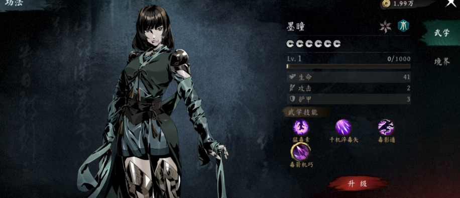 墨瞳:如果大家要组建一个以中毒为核心的阵容就可以用这个角色,她的能力当中的猛毒素就是会将毒素爆发造成的伤害提升50%,千机淬毒矢则是会消耗:30 内力值主动释放9枚毒箭,每发毒箭造成40%攻击力的水属性伤害,并附带1层中毒效果,冷却时间10秒,还有毒影遁的能力,使用闪避可对沿途敌人造成19%攻击力的水属性伤害,冷却3秒,攻击命中被中毒效果影响的敌人时,额外产生毒素爆发效果,造成39%攻击力的水属性范围伤害,并附带1层中毒效果,冷却5秒,最后的毒箭机巧,在攻击触发暴击时会额外发射1枚毒箭,对命中敌人造成26%攻击力的水属性伤害,并附带1层中毒效果。