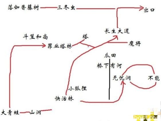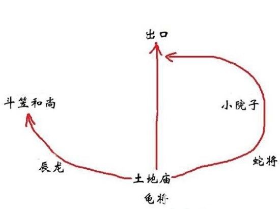 打亢金星君→龟岛土地庙→龟岛上钓鱼的青背龙→苦海北岸土地庙→左边打辰龙、救斗笠和尚→右边打无量蝠,调查蛇将骸骨,龟将落泪→回到龟将身边捡龟泪→找戌狗拿药,交给辰龙→进入如意画轴,申猴戌狗也在,辰龙种药材,挑战铁匠寅虎→戒语廊土地庙→【打坐蒲团】→亭子里遇到小和尚→拜四个佛找到上山的路→极乐谷