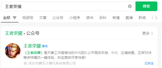 1、首进入微信后,在搜索框输入【王者荣耀】,接着点击下方的王者荣耀公众号。