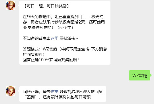 问题:在昨天的推送中,妲己宝宝提到「____-极光幻客」勇者皮肤限时秒杀仅剩最后2天,还可使用48皮肤碎片兑换(两个字)。