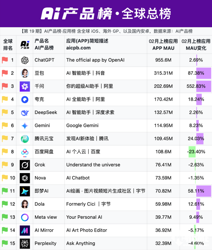 2026年2月AI产品榜公布:豆包月活3.15亿,登顶国内榜首