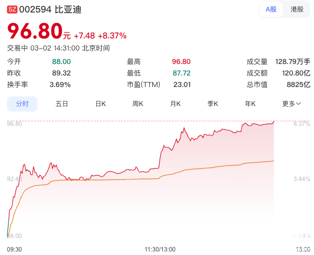 受此消息影响,3月2日,比亚迪A股股价陡然走高,截至发稿上涨8.37%至96.8元/股。3月5日的颠覆性技术发布会上,比亚迪或将给我们带来更多惊喜。